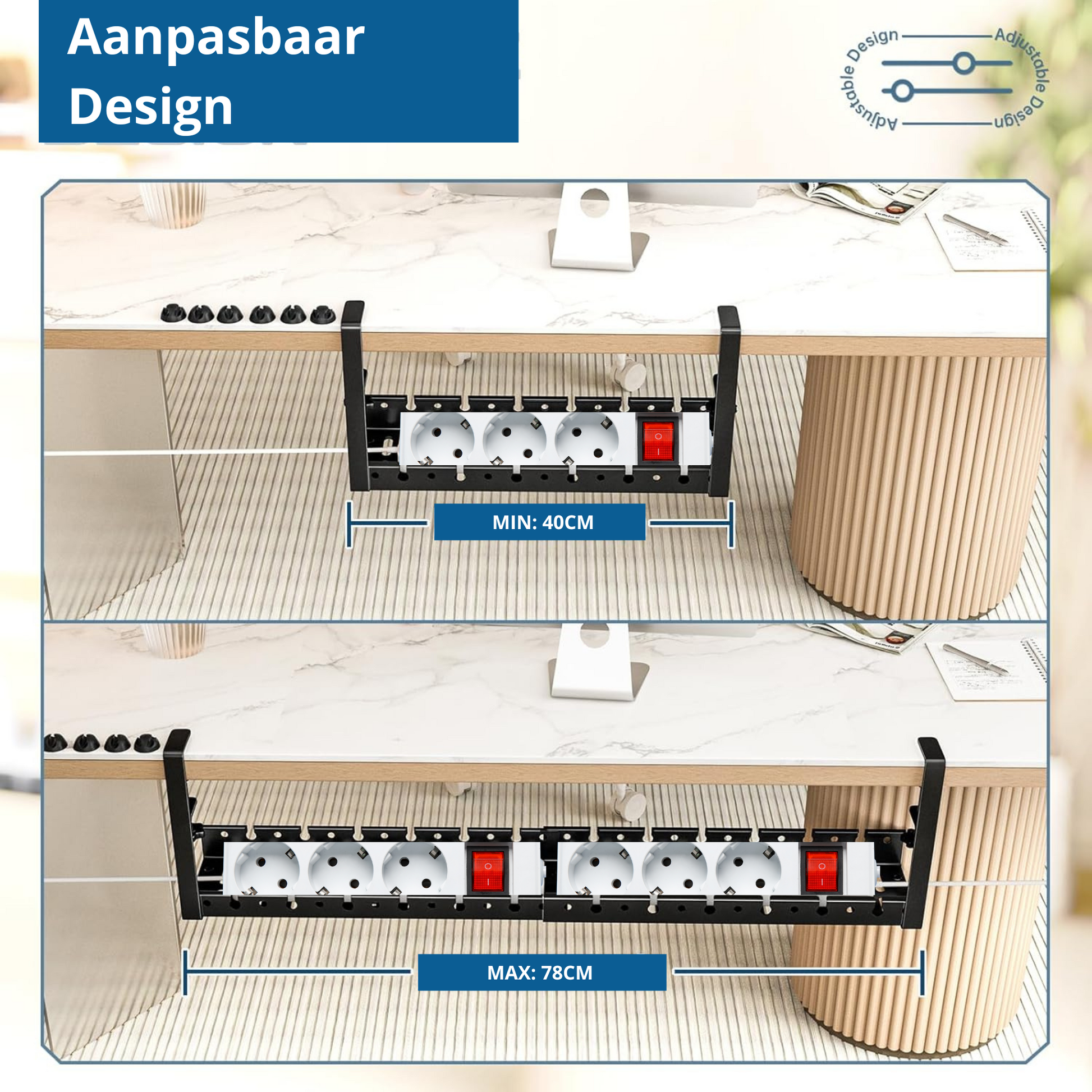 Gebruik de goten los van elkaar voor een compacte oplossing van 40 cm, of koppel ze aan elkaar voor een XL-lengte van 78 cm – ideaal voor grotere bureaus of meerdere kabels.