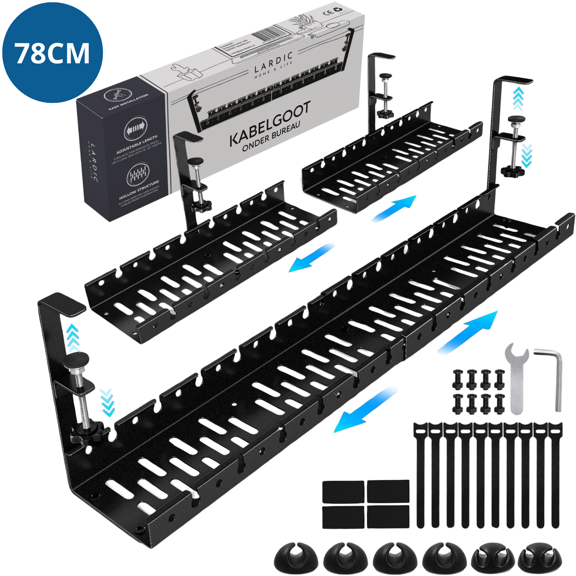 Lardic Metalen Kabel organiser Onder Bureau - Kabelgoot Bureau - Zonder boren - Kabelbox - Kabelhouder - Cable management - Opbergbox stekkerdoos - Inclusief accessoires - 2 delig set - 78 cm